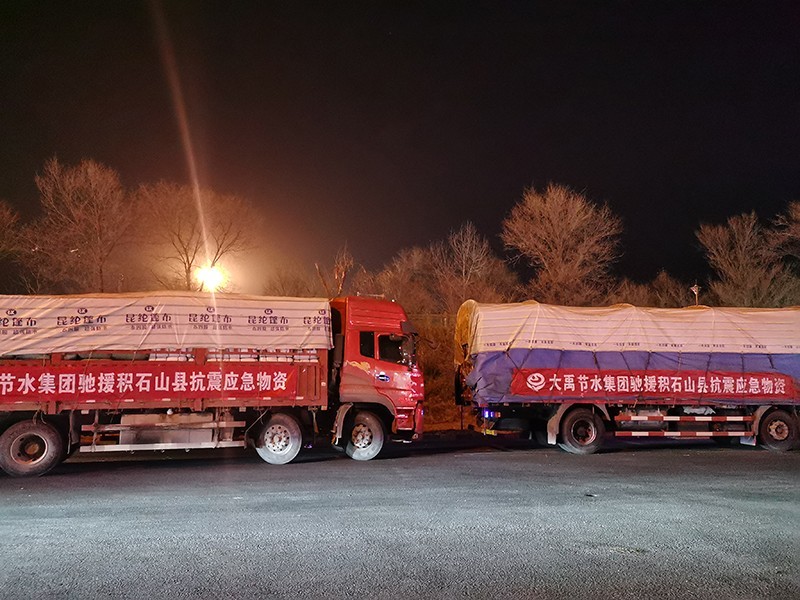 12月18日23时59分,甘肃临夏州积石山县发生6.2级地震。大禹节水集团紧急筹集7车救援物资(包括棉大衣3000件、帐篷120顶,炉子120套、块煤8吨、方便面2250箱、矿泉水2250箱、供水管材32??1.6MPa100级PE盘管23100米)驰援灾区。这批物资从19日下午起陆续运抵灾区。