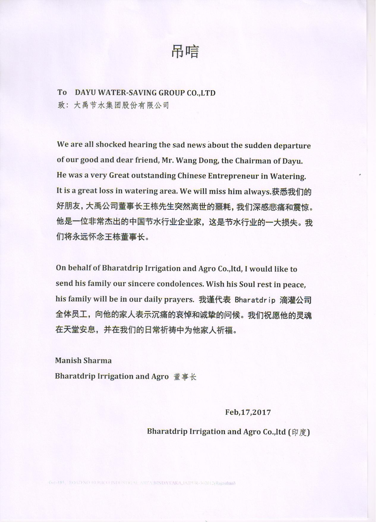 印度Bharatdrip lrrigation and agro co.ltd唁电