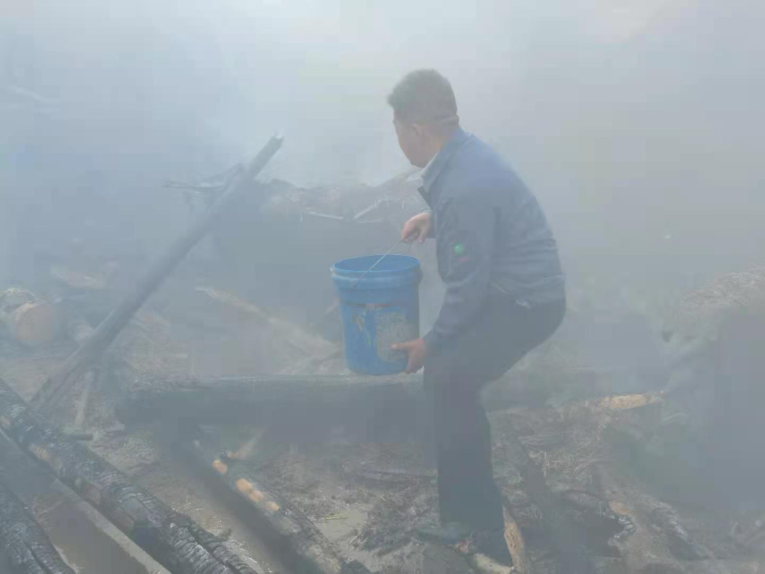 大禹6名员工到达现场后,发现三家农户的后院草棚已经全部起火,浓烟蔓延到整个院落。他们先让农户切断了自家电源,然后对明火进行扑救。由于当时风速太大,明火扑救效果不明显,于是他们果断在外围做隔离火源处理,拆除附近草棚,防治火势扩大蔓延。