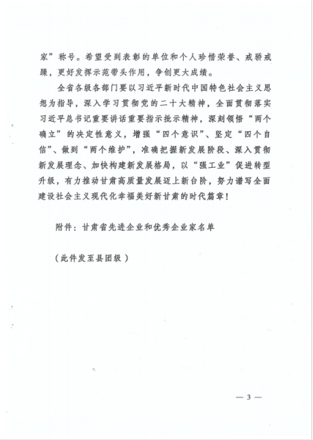 12月24日,甘肃省全省强工业行动推进大会暨先进企业和优秀企业家表彰大会在兰州召开,省委书记胡昌升出席会议并讲话。省委副书记、省长任振鹤主持会议?;嵋楸碚昧?8家先进企业和56名优秀企业家(获奖名单附文后),大禹节水集团股份有限公司荣膺“甘肃省先进企业突出贡献奖”,董事长王浩宇荣膺“甘肃省优秀企业家”称号。