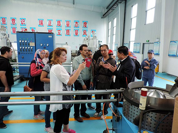 考察团一行先后参观了公司滴灌、PE、PVC生产车间以及公司产品展示区,详细了解了公司各类产品生产技术及实际运用情况。武威公司董事长王立军对考察团一行表示热烈欢迎,并就大禹节水集团公司的发展历程及近年来取得的各项成绩向考察团一行做了详细介绍,重点就滴灌产品及配套设备设施的生产工艺、生产流程、产品销售等情况进行了讲解。在公司各生产车间,考察团一行不时驻足仔细观察和了解节水灌溉产品生产过程及工艺,并与公司陪同人员亲切交流。