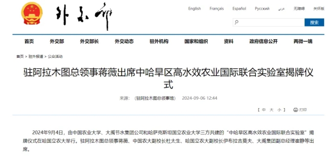 今年7月2日,在两国元首见证下,中国农业大学、哈萨克斯坦国立农业大学和大禹节水集团三方共建“中哈旱区高水效农业国际联合实验室”的协议入选两国合作清单。