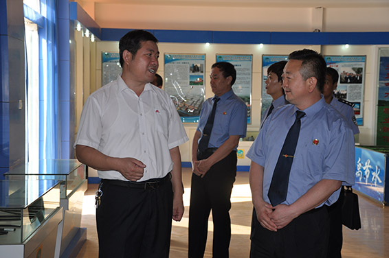 酒泉市检察院检察长蒋昱程与大禹节水集团总裁谢永生在公司展厅亲切交谈