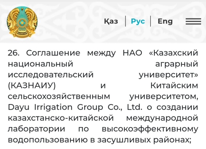 此外,两国元首的见证下,双方代表团签署了31项重要协议。其中,第26项为哈萨克国立农业研究大学与中国农业大学和大禹节水集团股份有限公司之间关于建立哈萨克斯坦-中国沙漠地区高效用水国际实验室的协议。