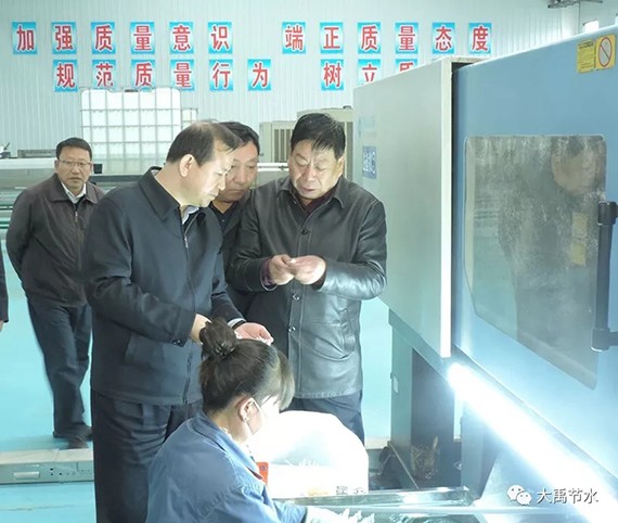 武威公司董事长王立军向柳书记一行重点介绍了集团公司八大业务板块发展方面的基本情况及“三农三水”方面的业务拓展情况。并汇报了公司近年来的经营状况和所取得的成绩,现场向调研组详细介绍公司PVC、PE管材、滴灌带及滴头的生产工艺流程,柳书记在参观期间,不时驻足询问生产工艺流程,王立军对提出的问题做了一一解答。宽敞的厂房、整洁的车间环境、井然有序的物料摆放、员工饱满的工作热情得到了随同领导们的肯定,也让调研组充分了解大禹规范的生产、严格的管理和优良的产品以及做大做强的信心。