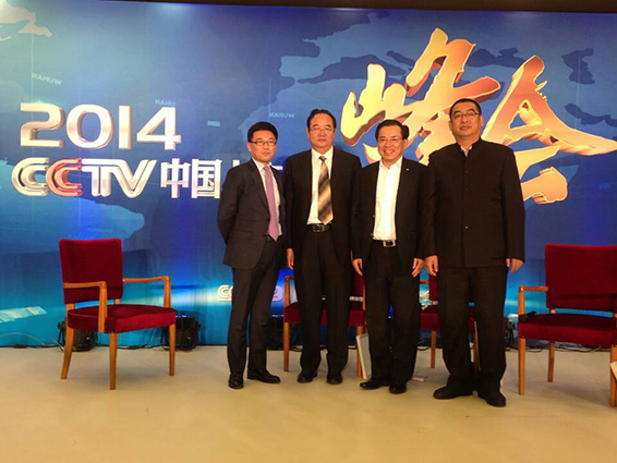 TCL集团股份有限公司董事长李东生(左三)、广东科达洁能股份有限公司董事长边程(右一)与集团公司董事长王栋在2014CCTV中国上市公司峰会上