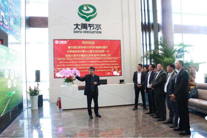 10月18日上午,蒙古国巴彦洪格尔市市长恩赫巴雅尔(Enkhbayar)、巴彦洪格尔市呼拉尔公民代表主席巴图才仁(Battseren)、巴彦洪格尔输电配电公司执行董事乌兰巴雅尔(Ulambayar);甘肃省政府外事办党组书记、办公室主任张宝军,省政府外事办党组成员、对外友协专职副会长梁保平,省对外友协友城工作处处长康广宏一行领导莅临大禹节水集团北京研发中心考察座谈,大禹节水集团党委书记王冲等陪同。