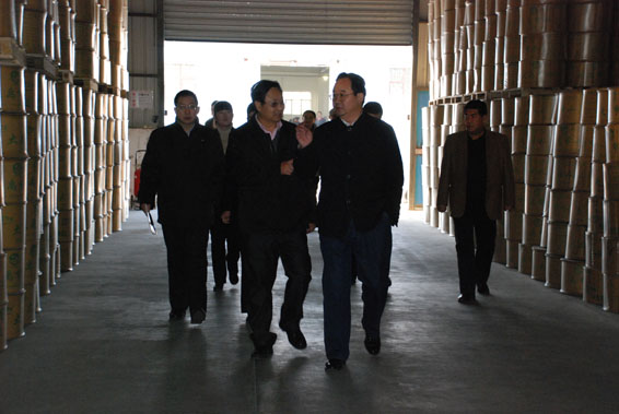项目验收专家组一行在集团公司董事长王栋的陪同下在公司成品库房参观考察