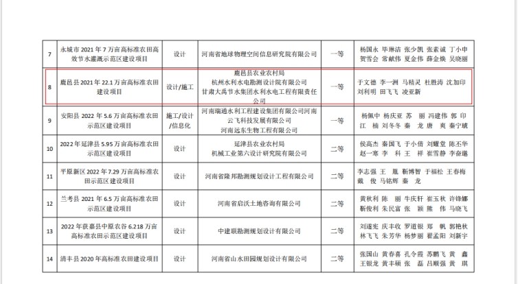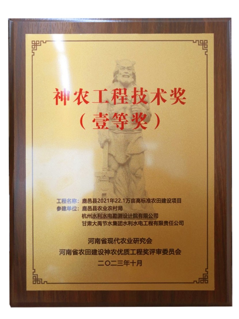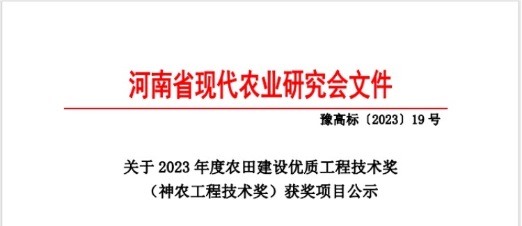 12月26日,河南省农业农村厅、高标准农田建设专业委员会对获得2023年度农田建设优质工程技术奖(神农工程技术奖)的单位进行了公开表彰及颁奖。大禹节水承建的鹿邑县2021年22.1万亩高标准农田建设项目荣获神农工程技术奖一等奖。