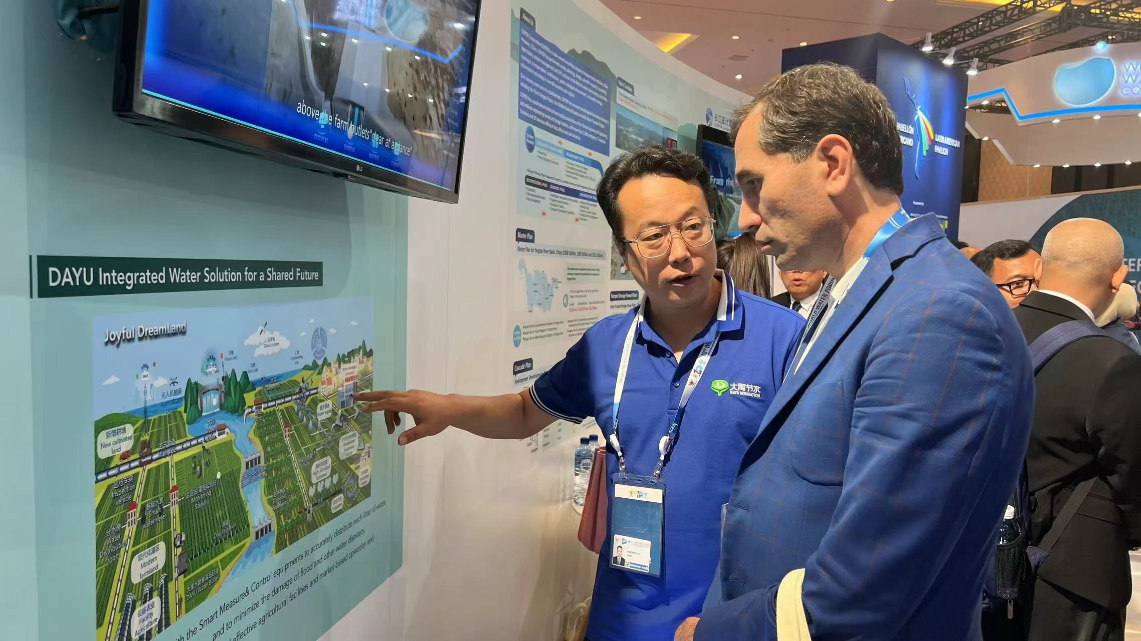 论坛同期举行了世界水展,中国馆位于国家馆主馆区,集中展现了中国水利工程、技术等方面的卓越成就。大禹节水作为行业龙头企业,展区内人潮涌动,热闹非凡,大禹节水一体化解决方案成为参观者驻足的焦点。期间,水利部部长李国英莅临大禹节水展位参观,听取集团董事长王浩宇对公司业务及项目等情况的汇报。