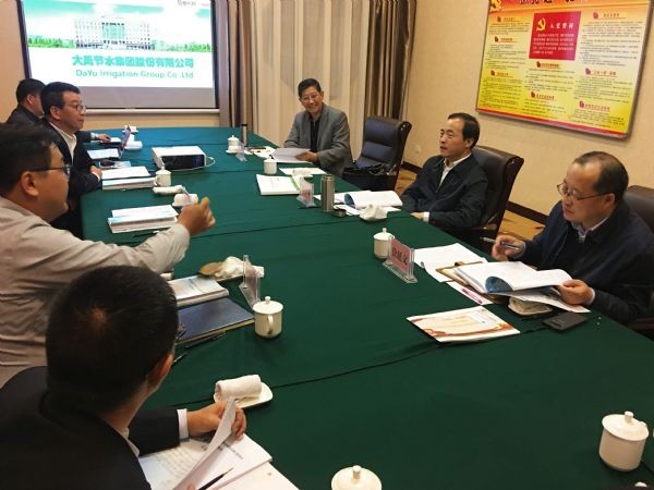 董事长王浩宇就公司目前的经营情况进行了详细汇报,并对节水行业现代化发展的模式:构建基础设施网、水利信息网、运营服务网三为一体的建、管、服体系进行了全面阐述,对公司近些年来探索成功的水权分配、水权交易、节水激励、精准补贴等一批可复制可推广的陆良模式、元谋模式、武清模式、通辽模式、沙雅模式、荣昌模式进行了全方位的介绍。同时,指出,大禹节水业务覆盖全国各省市,作为甘肃本地的企业,公司有义务也有能力为家乡的节水事业做出应有的贡献。