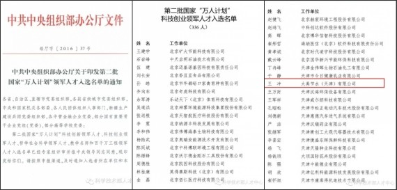 8月1日,中共中央组织部办公厅印发《关于第二批国家"万人计划"领军人才入选名单的通知》(组厅字〔2016〕37号),第二批国家"万人计划"领军人才人选名单正式向全社会公布结果,共有620名科技创新领军人才和336名科技创业领军人才入选。大禹节水集团公司副董事长、大禹节水(天津)有限公司董事长王冲成功入选国家"万人计划"领军人才。