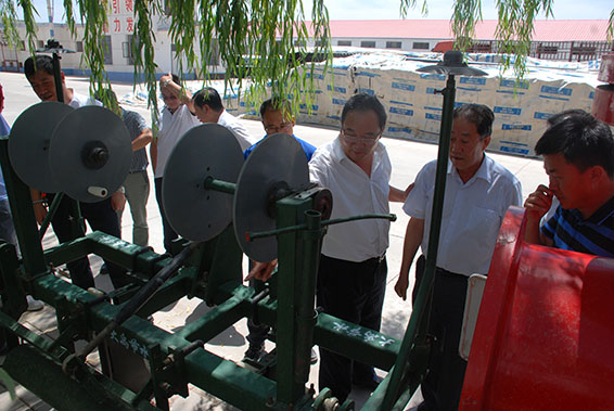 大禹节水集团公司董事长王栋向宁夏自治区水利厅副厅长毕廷和一行介绍公司研发生产的地埋式滴灌铺设机具