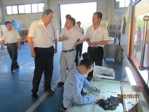 集团公司董事长王栋向皮建华处长介绍内镶贴片式滴灌管生产线操作工艺
