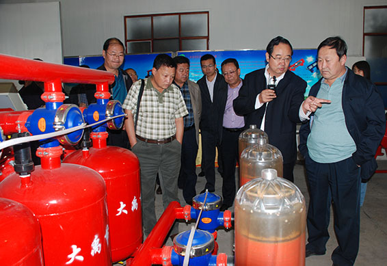 集团公司董事长王栋向阿拉善盟考察团一行介绍公司研发生产的全自动施肥过滤器产品