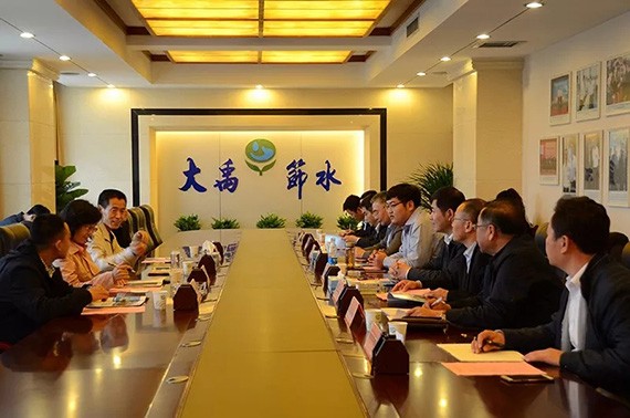 现场考察结束后,双方进行了座谈交流。大禹节水集团董事长王浩宇对山西水务投资集团领导一行莅临公司考察表示热烈欢迎。王浩宇就公司基本情况及八大业务板块进行了介绍,王浩宇表示,大禹节水集团始终以农和水为中心,形成了以“农业高效节水、农民安全饮水、农村污水处理”的产业格局,实现了全产业链覆盖并取得了良好的社会效应。重点介绍了公司在“三农三水”方面取得的成绩及PPP项目模式在全国的推广建设情况。王浩宇表示,大禹节水集团愿与山西水务投资集团强强联合,充分发挥双方资源优势,互利共赢,共同开发山西水务事业,为使农业更智慧、农村更美好、农民更幸福做出应有的贡献。