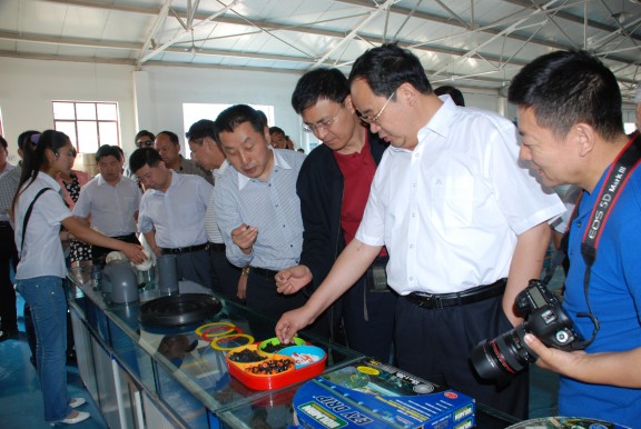 大禹节水集团董事长王栋向清华大学集团管控总裁班学员介绍集团自主研发生产的各类现代化高效节水灌溉产品