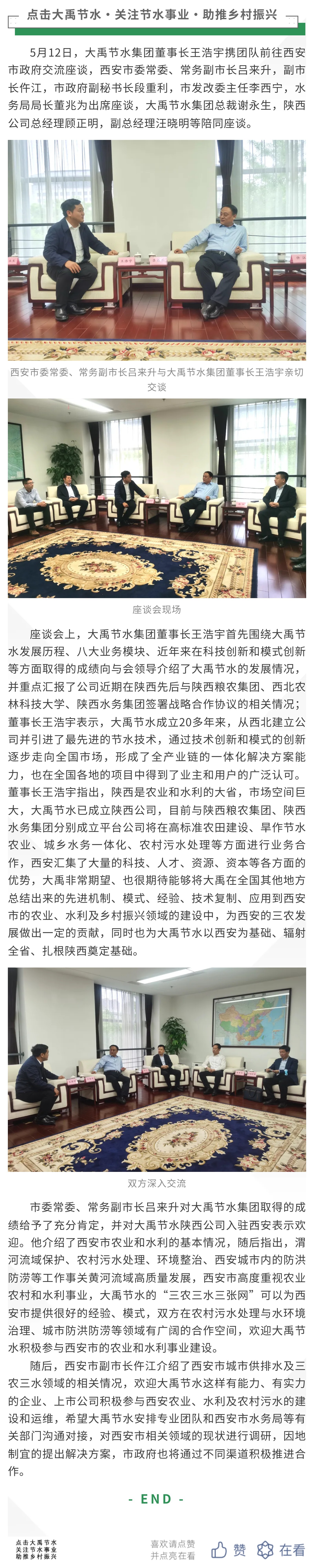大禹动态| 西安市委常委、常务副市长吕来升会见大禹节水集团董事长王浩宇一行