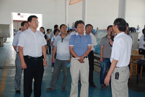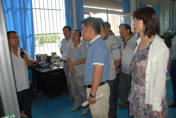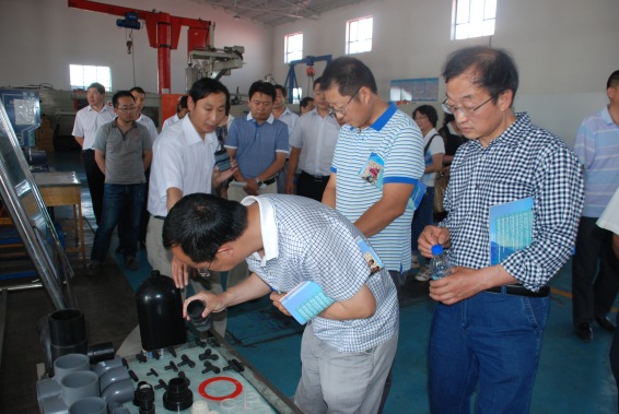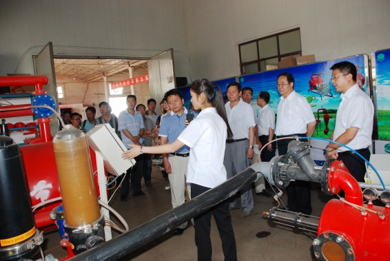 在大禹节水集团董事长王栋陪同下,李福泉局长一行在大禹节水灌溉设备公司参观考察大禹节水集团研发生产的施肥过滤器产品