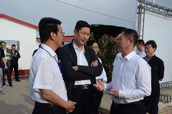 ▲大禹节水集团党委书记王冲(左一)农业农村部总农艺师马爱国(左二)天津市武清区委副书记、区长戴东强(左三)现场交流