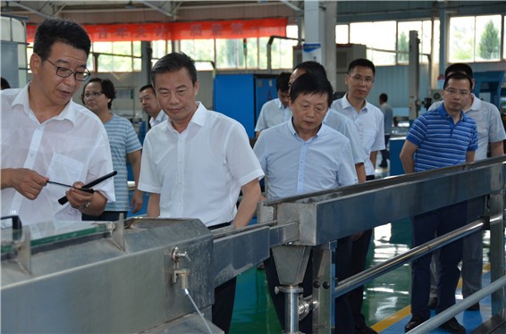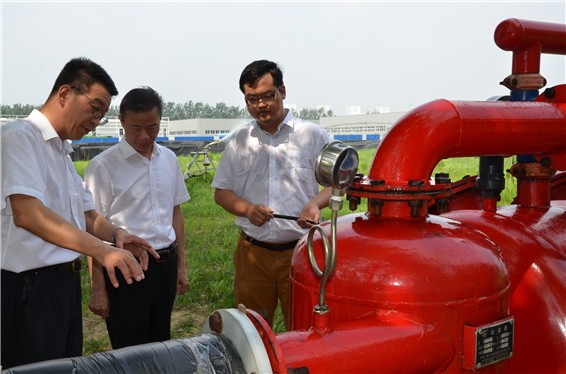 大禹节水集团公司党委书记、副董事长王冲,董事长王浩宇陪同吴盛海局长一行在公司自主研发生产的自动化施肥过滤器实验区参观