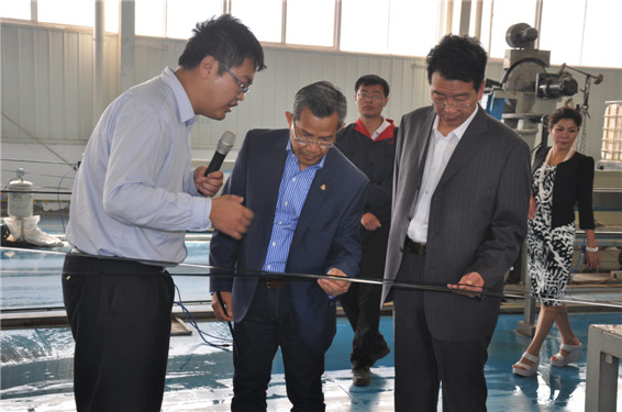 天津大禹节水科技有限公司总经理王浩宇向柬埔寨副首相一行介绍滴灌带生产工艺