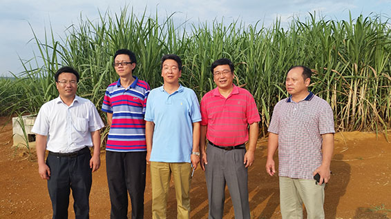 集团公司副董事长王冲(左三)陪同中国成套设备进出口(集团)总公司(中成集团)副总经理韩宏(右二)、中成国际糖业股份有限公司(中成糖业)副总经理李明(左二)在大禹节水广西崇左市江州区甘蔗种植基地以及公司在江州实施节水灌溉项目的工地考察