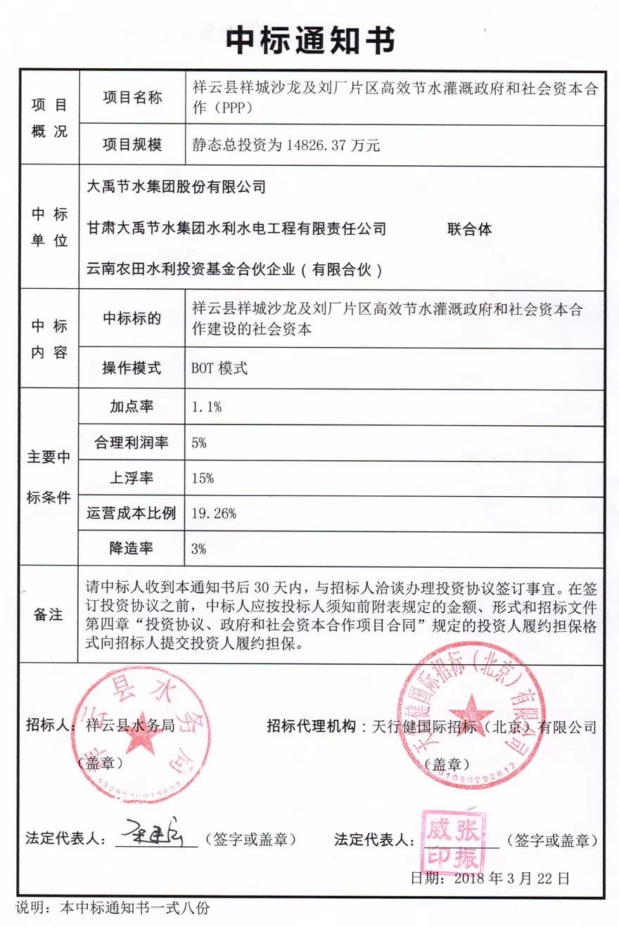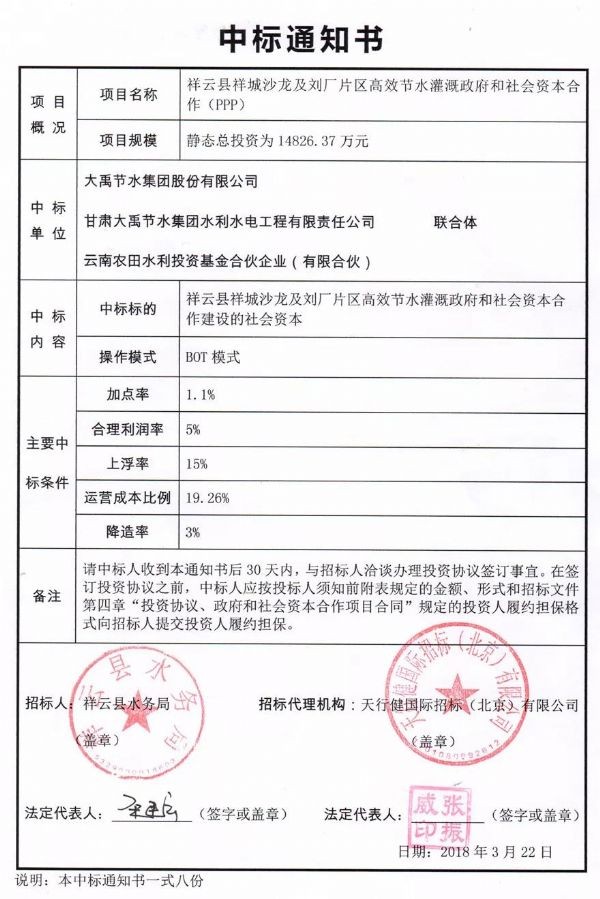 近日,大禹节水集团股份有限公司收到云南省大理州祥云县祥城沙龙及刘厂片区高效节水灌溉政府和社会资本合作(PPP)项目中标通知书,成功成为项目中标社会资本方。项目静态总投资为14,826.37万元,项目合作期为20.58年,其中建设期0.58年,运营期20年。项目位于祥云县祥城镇、沙龙镇及刘厂镇,合计实施高效节水灌溉面积5万亩,其中:祥城沙龙片区灌溉面积3.4万亩;刘厂片区灌溉面积1.6万亩。工程内容包括取水工程、输水工程、配水工程、田间工程及自动化工程。