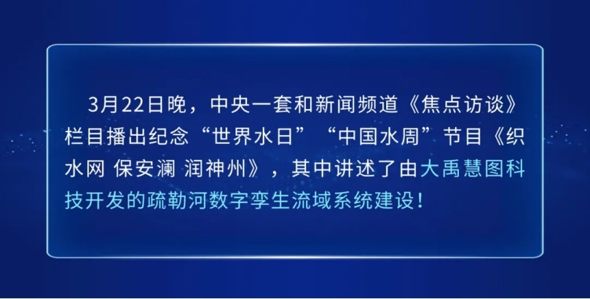 此前,央视新闻频道以“数字孪生技术助力134万亩农田畅饮智慧水"为题对大禹慧图科技开发的疏勒河数字孪生系统进行了报道。