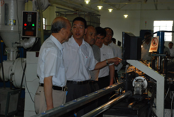 大禹节水集团副董事长王冲向调研组一行介绍滴灌管(带)生产工艺