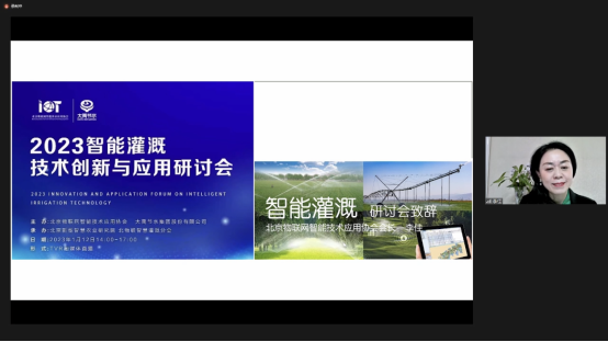 为进一步推动智能灌溉领域技术创新,促进智能灌溉全产业链上下游的深度交流与合作,1月12日下午,由北京物联网智能技术应用协会、大禹节水集团主办,北物联智慧灌溉分会、北京新型智慧农业研究院承办的“2023智能灌溉技术创新与应用研讨会”通过TVR融媒体直播的形式举办,本次会议得到了业界的广泛关注,观看直播突破10000人次。北京物联网智能技术应用协会会长李佳,大禹节水集团高级副总裁、农水集团总裁崔静为本次会议致辞。