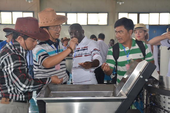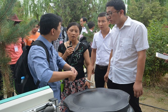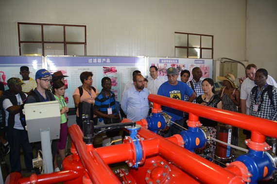 大禹节水集团技术负责人正在向"2016年发展中国家干旱区水资源可持续发展研修班"学员介绍公司全自动施肥过滤设备