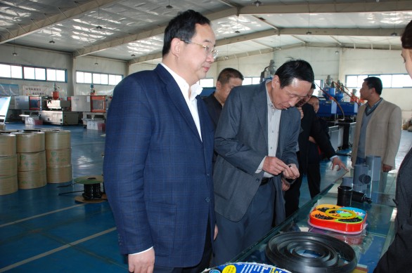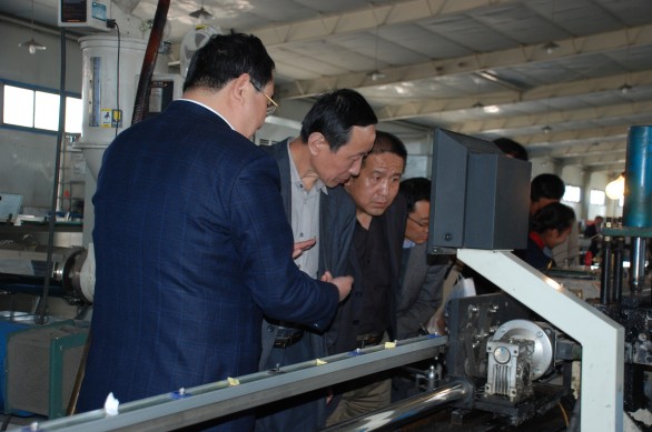 大禹节水集团董事长王栋向颜鲁信一行介绍滴灌管(带)生产工艺