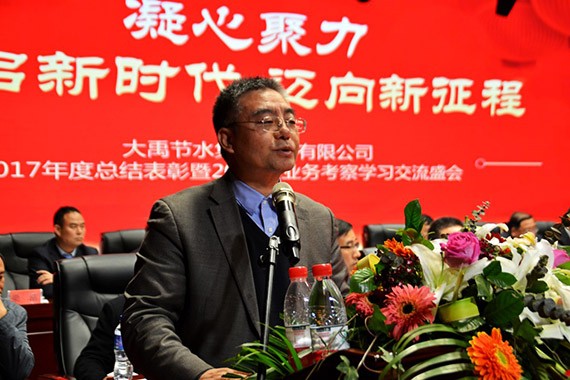 王浩宇指出,2017 年是大禹集团发展历程中极其不平凡的一年,也是面临挑战最多、压力和困难最大的一年,在以党委书记为核心的经营班子带领下,紧紧围绕"保增长、调结构、促发展"的思路,全年超额完成了各项任务目标,模式转型、结构调整、产业格局、人才队伍建设等各项工作取得重大胜利。王浩宇指出,党的十九大报告为集团发展指明了方向,进入新时期,围绕做优做强,必须坚持"三农三水"的产业定位和"八大业务板块"协同发展的总思路;自觉坚持"四个自信、四个核心、四个全面" 不动摇,正确处理好" 速度与质量、规模与效益、新兴与传统、调整结构与控制资产负债率"四个关系。