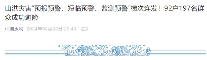 2024年8月28日“中国水利”微信公众号以《山洪灾害“预报预警、短临预警、监测预警”梯次连发!92户197名群众成功避险》为题报道了大禹慧图科技开发运维的新疆维吾尔自治区水旱灾害监测预警平台在山洪预警中发挥的重要作用。