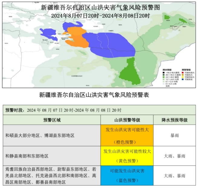 水利部针对博湖县发布山洪灾害临近黄色预报预警,8日0时20分,升级为橙色预警。