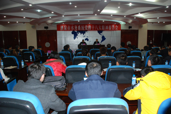 11月19日上午,酒泉市水务系统党的十八大精神传达报告会在酒泉市国际会展中心举行,党的十八大代表、大禹节水集团党委书记、董事长王栋向全市水务系统党政干部职工作报告传达十八大精神。市水务局副局长肖占全主持报告会,市水务局局长李耀及各县市水务局局长等领导认真听取了报告。市水务局,水利系统老干部支部,市水电设计院、水管站等全市水务系统100多名党政干部职工聆听了本次报告会。