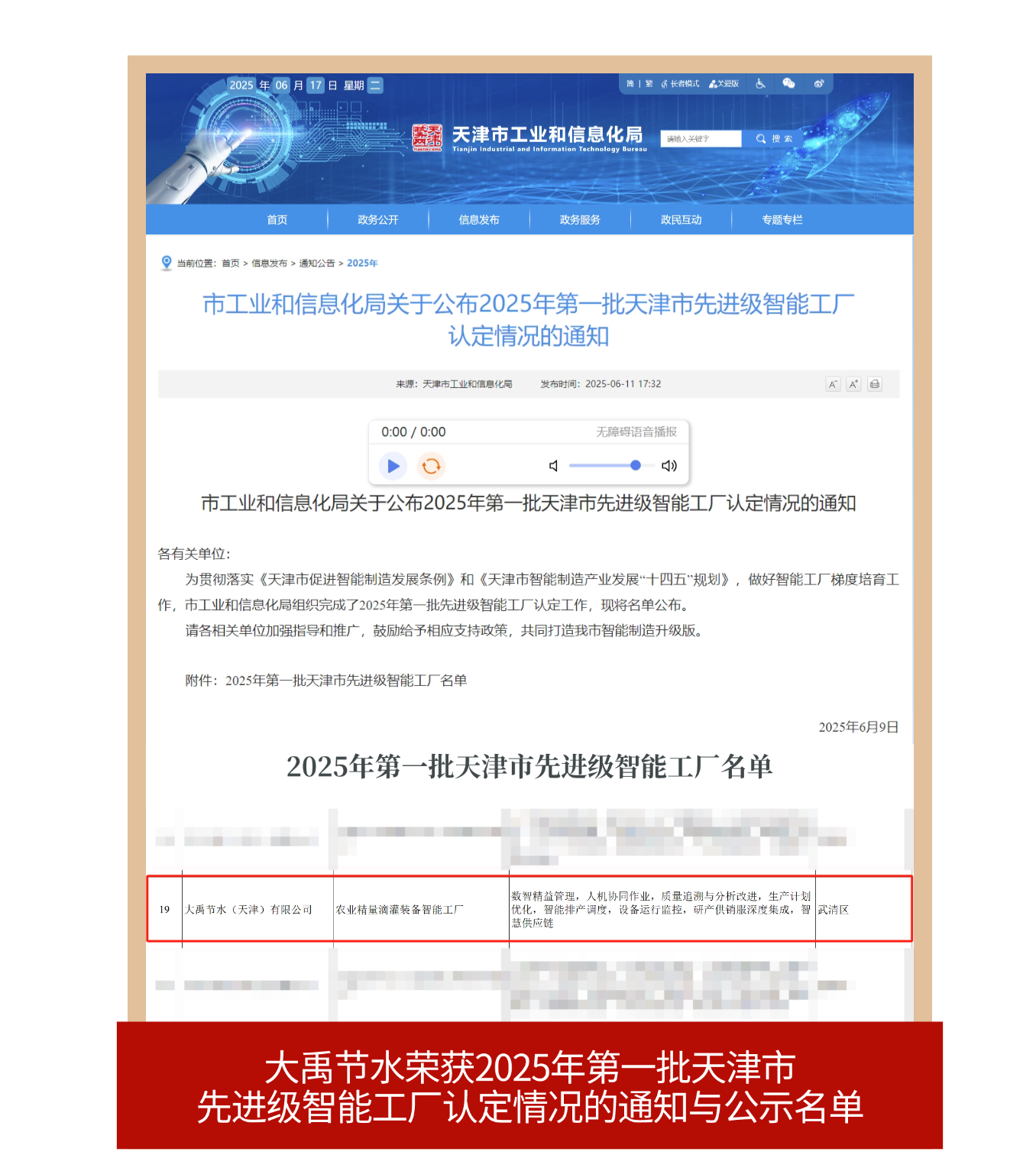 大禹荣誉| 大禹节水荣获2025年第一批天津市先进级智能工厂认定