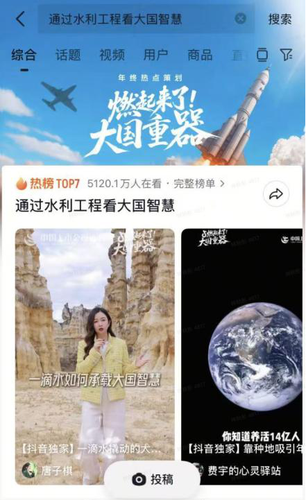 视频在抖音平台发布后,迅速引起网友关注,5条视频累计播放量近890万,点赞超过24万,相关话题 #通过水利工程看大国智慧 登上总榜TOP7,用户评论“没想到还有大禹节水这样把论文写进大地上的公司”。创作者们的科普让大家看到,每一片丰收的良田背后,都离不开高效的节水技术和水利建设者的辛勤付出,而以大禹节水为代表的中国企业,正以其创新实践,守护国家水资源安全,扎实践行国家粮食安全战略。
