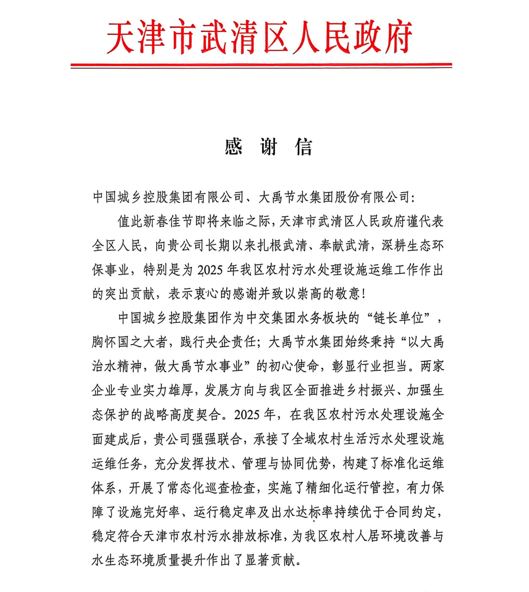 信中特别指出,大禹集团与中国城乡控股集团强强联合,承接了武清区全域农村生活污水处理设施运维任务。我们凭借专业的技术能力、丰富的实践经验和严谨负责的担当精神,构建了标准化运维体系,开展常态化巡查检查,实施精细化运行管控。