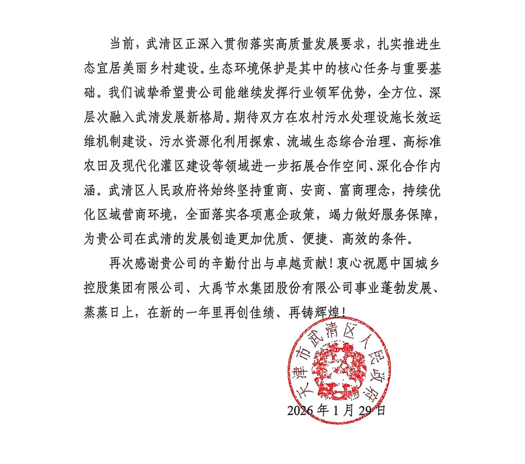 这一系列举措有力保障了设施完好率、运行稳定率及出水达标率持续优于合同约定,稳定符合天津市农村污水排放标准,为武清区农村人居环境改善与水生态环境质量提升作出了显著贡献。武清区人民政府在信中高度肯定了大禹集团“以大禹治水精神,做大禹节水事业”的初心使命,以及彰显出的行业担当。信中表示,大禹集团发展方向与武清区全面推进乡村振兴、加强生态保护的战略高度契合。武清区人民政府诚挚希望大禹集团继续发挥行业领军优势,全方位、深层次融入武清发展新格局。未来,双方期待在农村污水处理设施长效运维机制建设、污水资源化利用探索、流域生态综合治理、高标准农田及现代化灌区建设等领域进一步拓展合作空间。