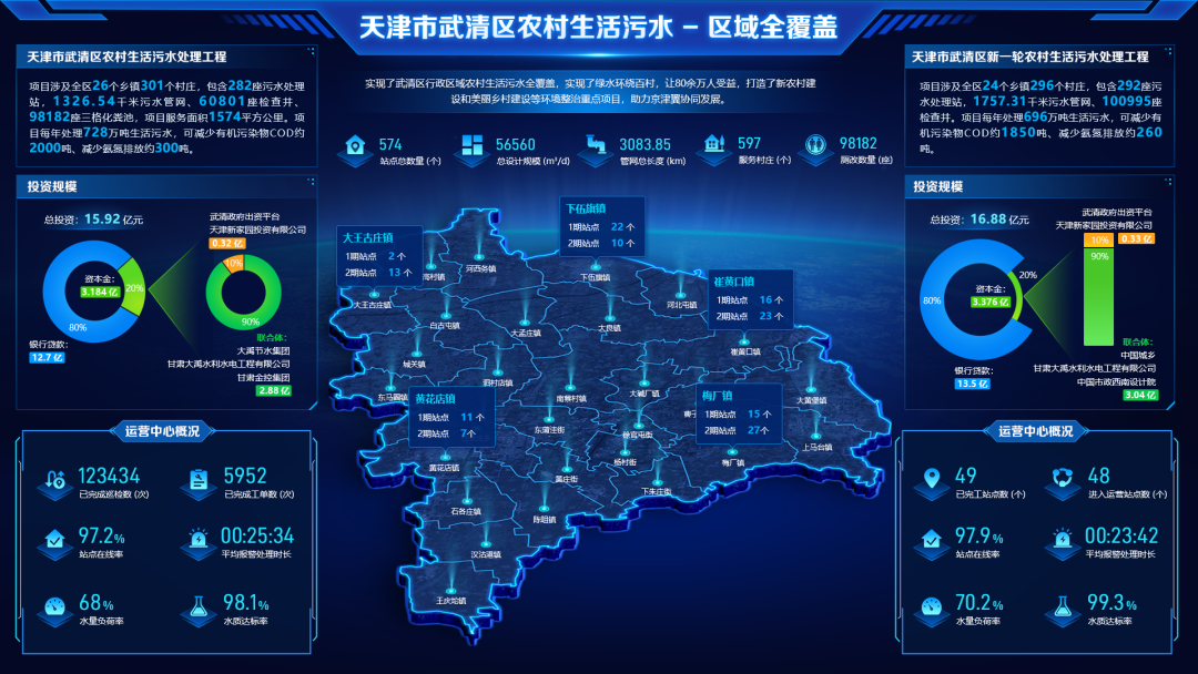 大禹集团充分发挥全产业链优势、技术和人才优势,在武清农村生活污水处理项目中,设置专业部门对项目工程设计、工艺技术、装备制造、施工建设、运营维护进行全生命周期管理,真正实现建、管一体化。通过项目实施,武清区完成了301个村的污水处理厂站和污水配套管网建设,以及旱厕改造、电力、绿化围栏等配套工程,实现生活污水处理设施100%全覆盖。