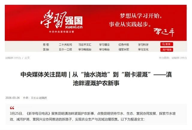 新华社记专题采访了大禹集团滇池流域深化农业水价综合改革及现代化灌区项目,评价该项目便利了农户田间供水、重塑了农业用水秩序,改善了水质与景观,实现了“政府节水、农民增收、农业增产、企业增效”。