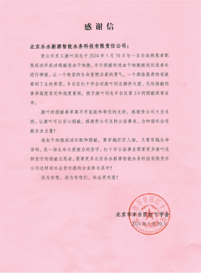 1月19日,北京市第641例造血干细胞捐献顺利完成,捐献者是来自大禹乐水公司的一位年仅29岁的水利工程师康叶。他将这份特殊的礼物——生命的种子,无私地献给了一位10岁的血液病患儿,让这个濒临绝境的家庭重燃希望。