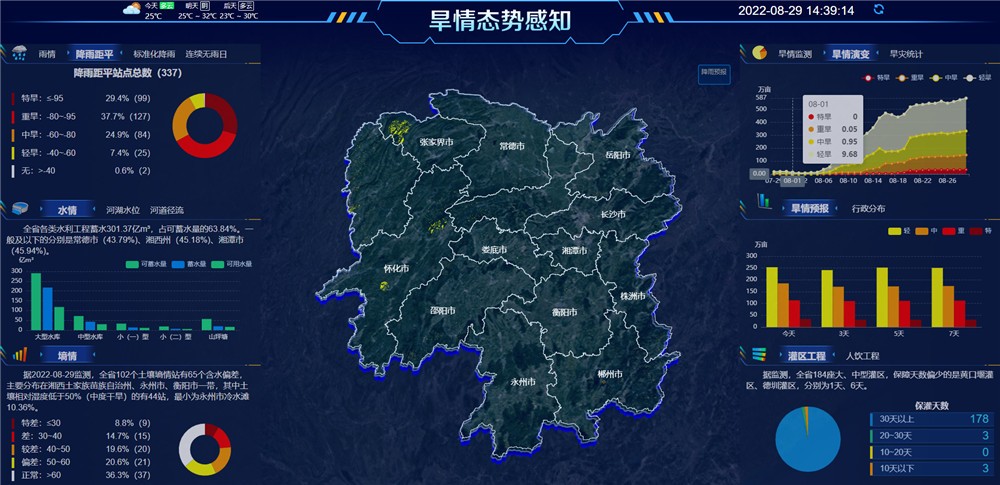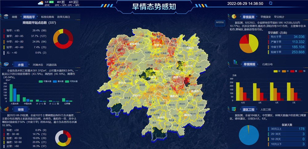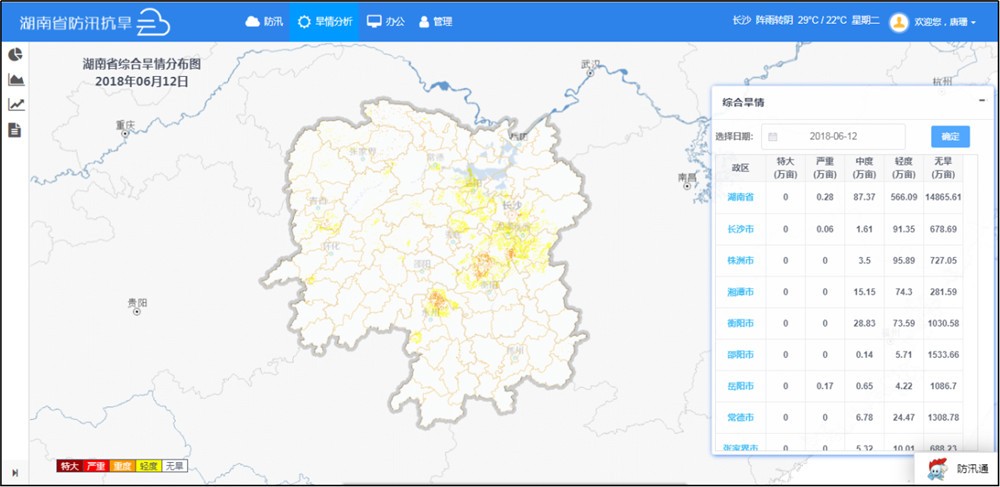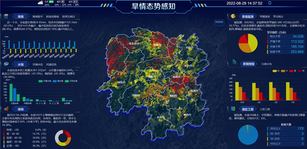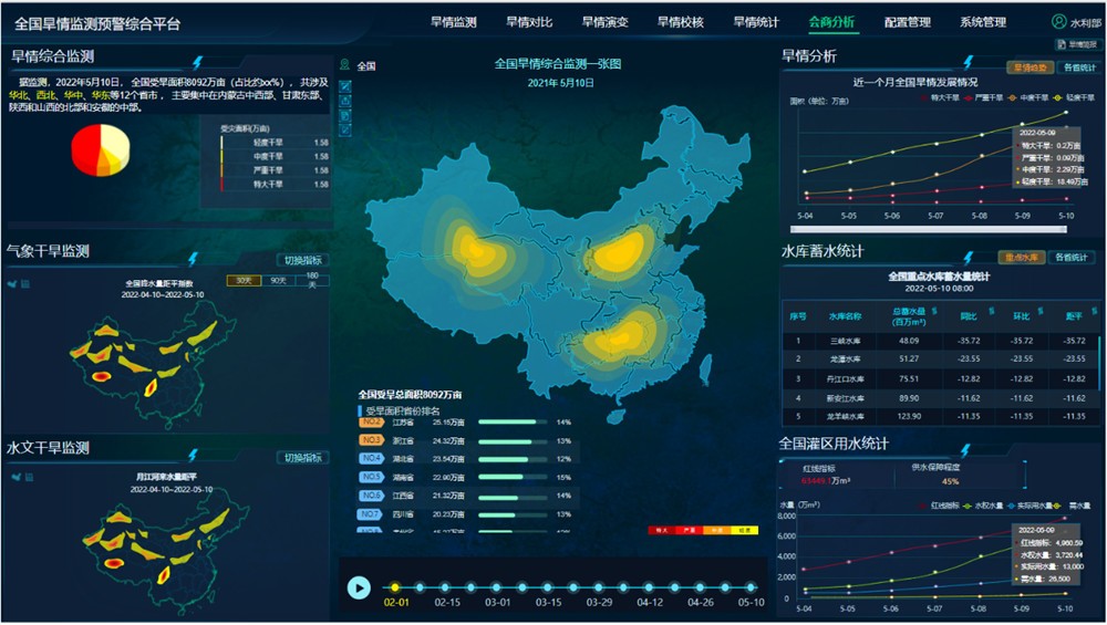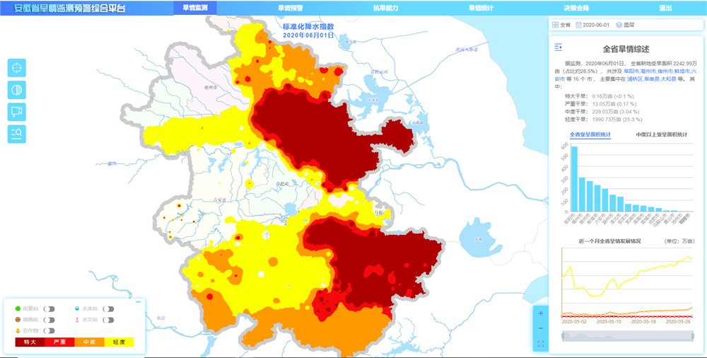 旱情监测预警综合管理平台是在采用雨水墒情进行旱情分析的基础上,结合下垫面条件进行旱情的综合评估,特别是针对区域精准化进行旱情分析、受旱面积评估、水资源量蓄水与耗水分析、水文、气象、农业数据的共享、旱情分析及展示等方面进行研究,持续满足抗旱管理的需求,完善现有监测体系和旱情评估系统,提升旱情监测预警水平。