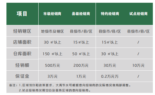 4、资金保障:经销商应具备资金条件:具有独立法人资格的注册资金需不小于100万,流动资金不小于30万。
